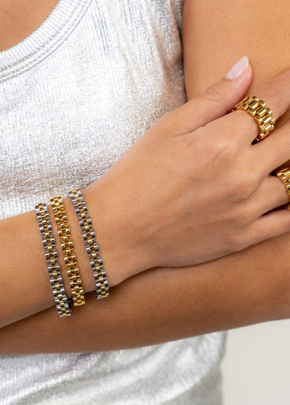 The Bracha Mini Rolly Bracelet adds a touch of chic to any look with its silver and gold-tone links. Made in the USA and finished with a classic clasp closure, this 7" bracelet is the perfect everyday accessory to mix, match, and stack.