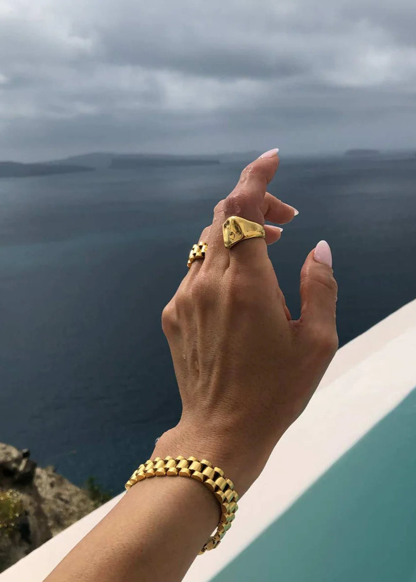 Like a watch but not. Our gorgeous golden Rolly bracelet gives you dressed-up or edgy cool girl vibes with our timeless watchband style.