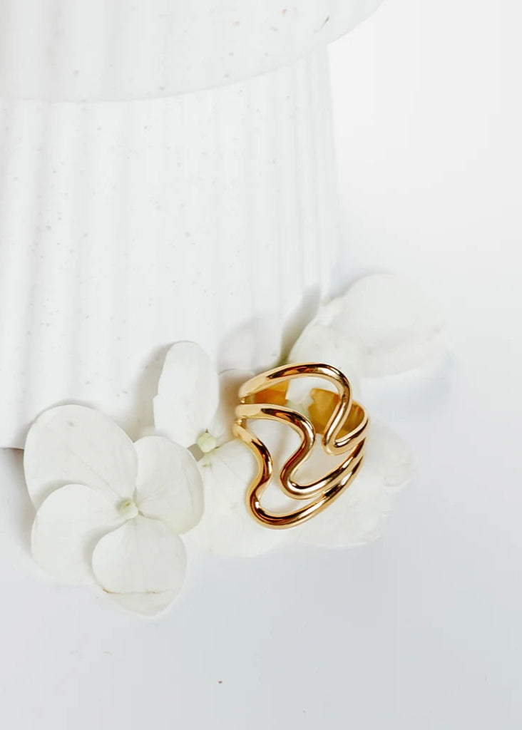 The Bracha Waves Ring effortlessly creates the look of multiple stacked bands, adding a touch of elegance to any outfit. Yet perfect to wear with your casual fits. This ring is made with a gold-filled adjustable band and a design that mimics the movement of waves.