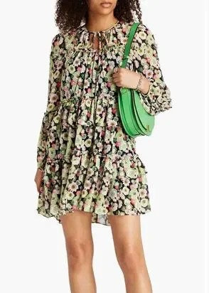Playful and feminine, this floral mini dress features romantic ruffled tiers, a tie-front neckline, and voluminous puff sleeves. With its vibrant print and flirty silhouette, it’s a standout choice for any occasion.