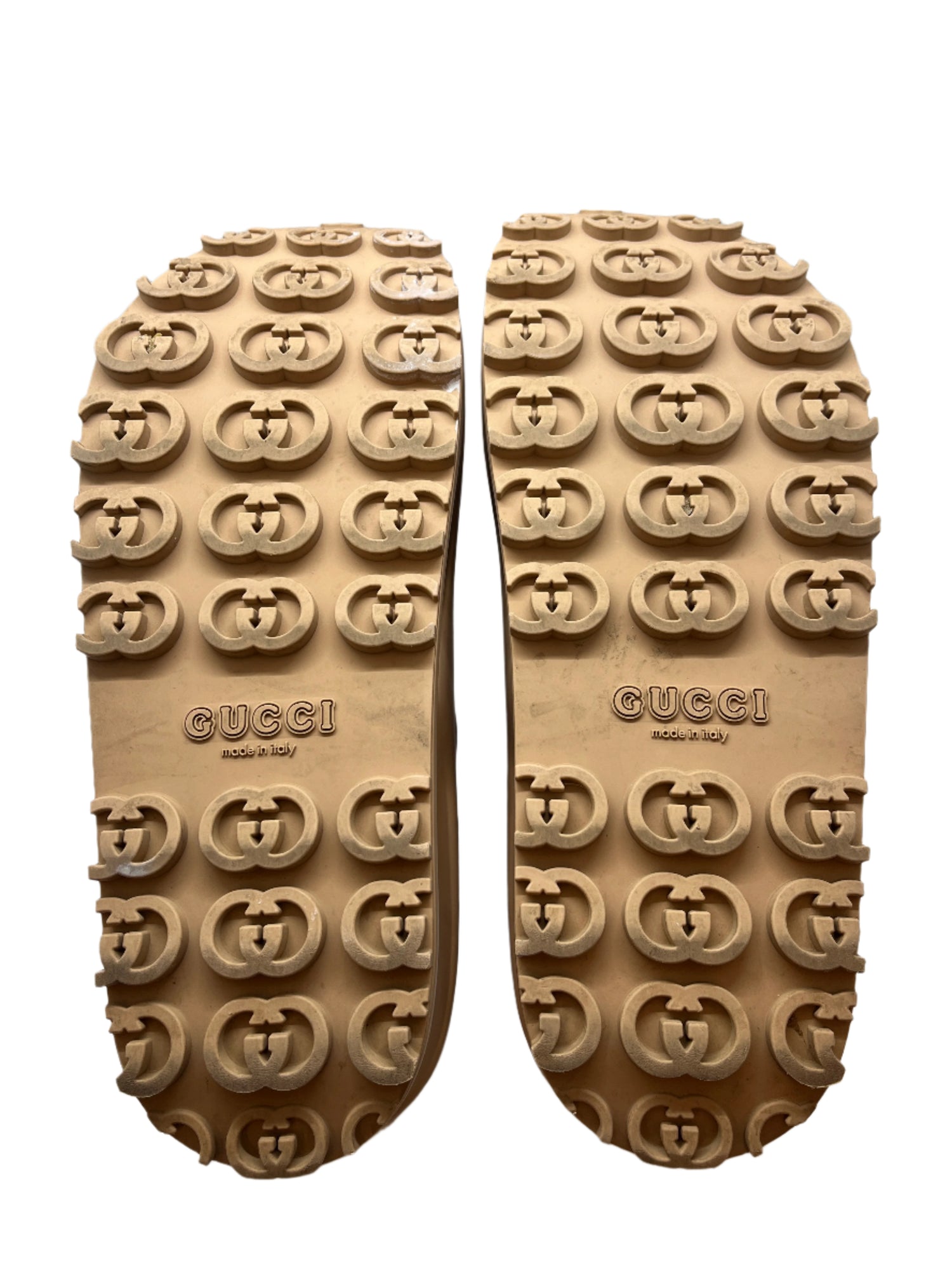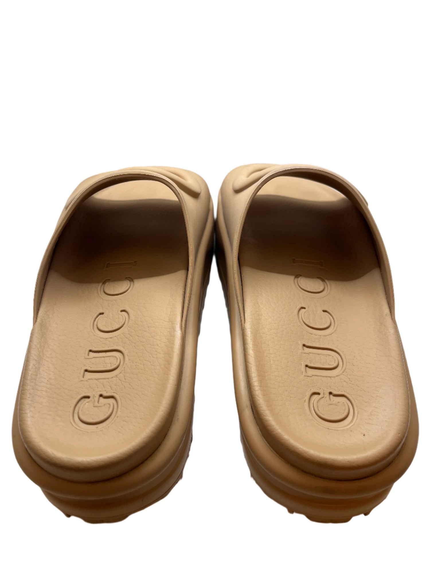 Elevate your casual footwear with these Gucci rubber slides in a versatile nude shade. Featuring the iconic interlocking G logo prominently on the front, they combine luxury branding with everyday comfort. Crafted from durable rubber, these slides offer easy wearability and a sleek, minimalist design perfect for both indoor and outdoor use. Ideal for those seeking a blend of style and practicality.