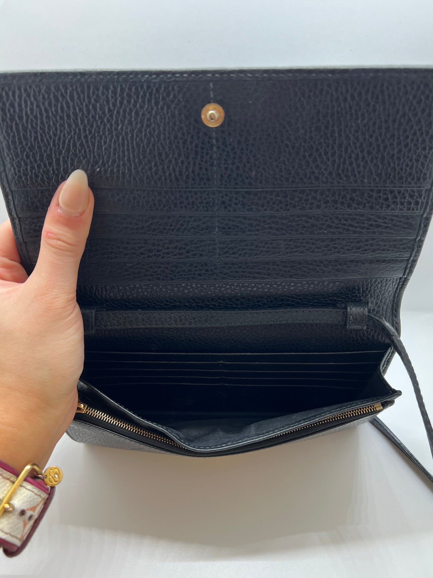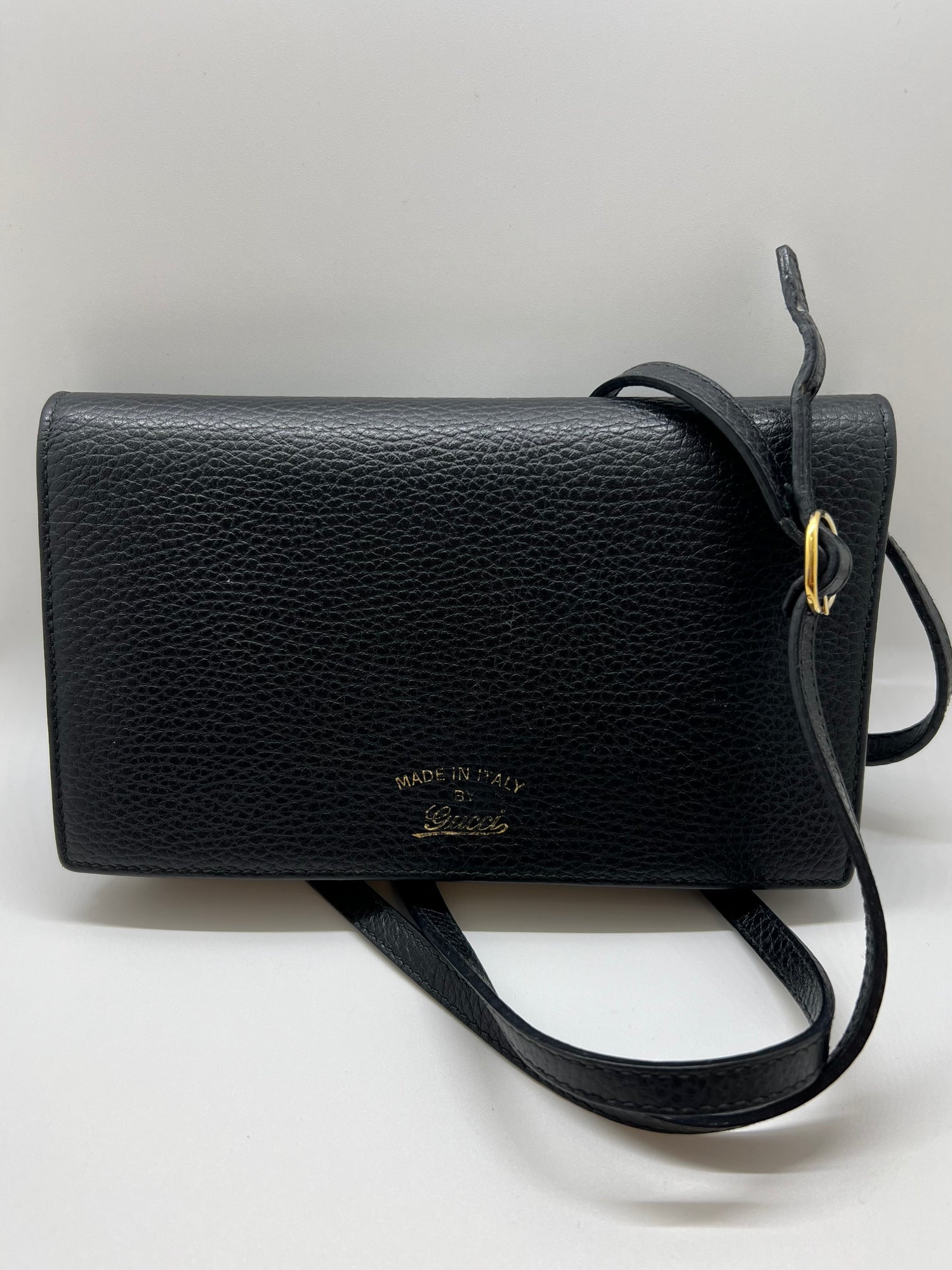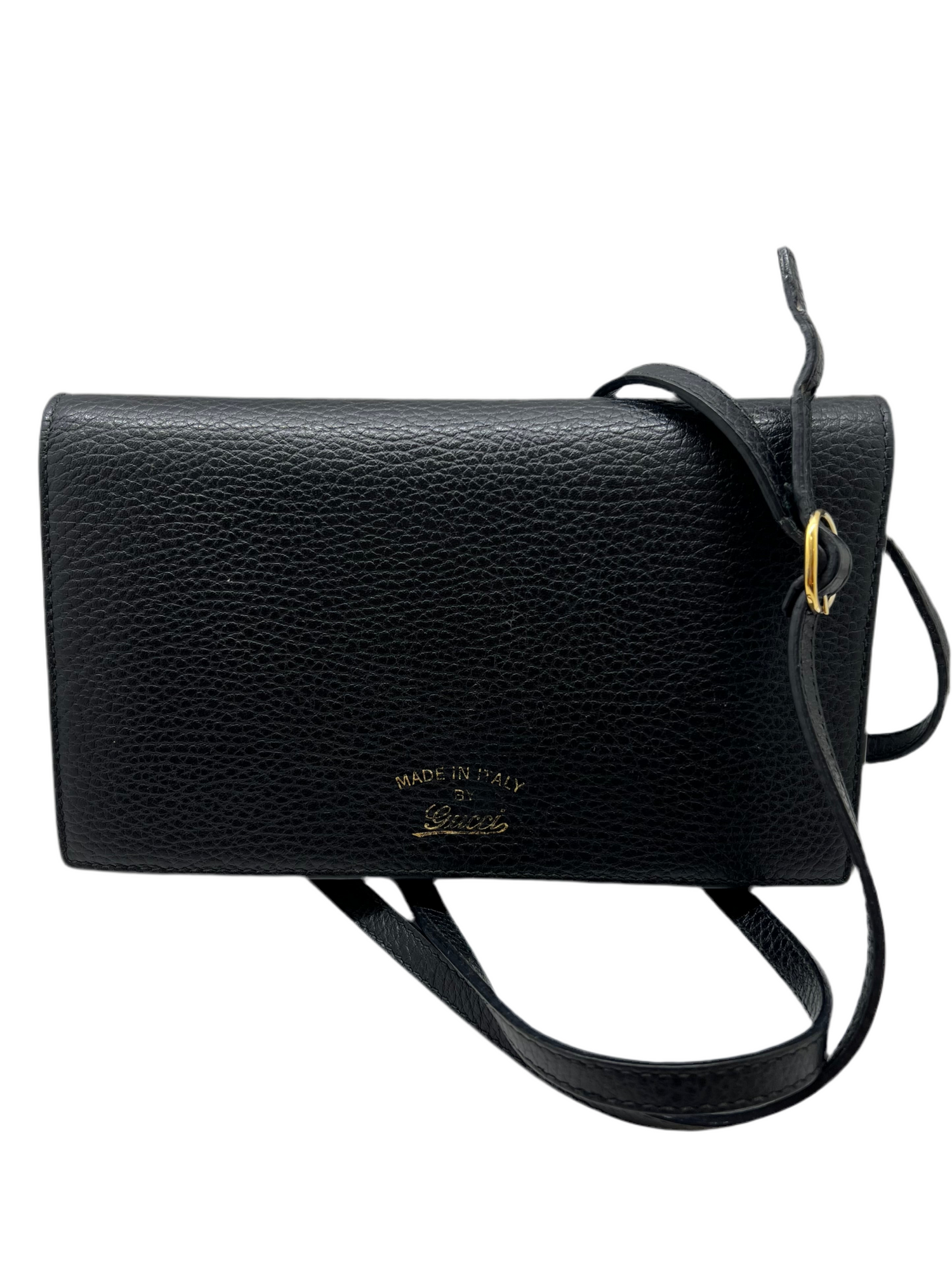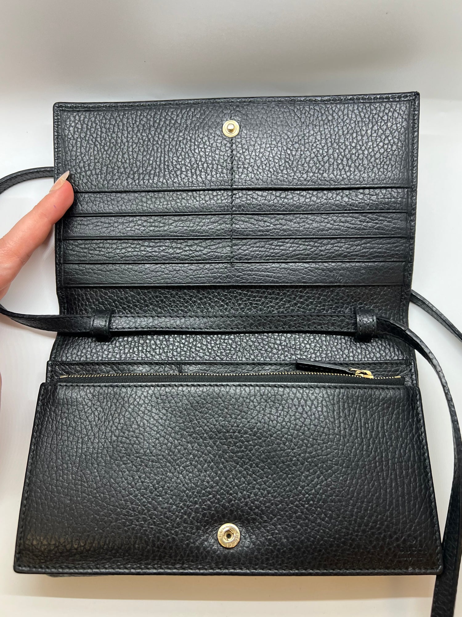 The Gucci Swing Shoulder Wallet combines elegance and versatility, featuring a gold-tone cursive logo on luxurious grained leather. This stylish accessory functions as both a shoulder bag and a long wallet, offering convenience and sophistication. With a secure snap closure and sleek design, it's perfect for day-to-night use. Dimensions: 7.5" W x 4.3" H x 0.8" D.