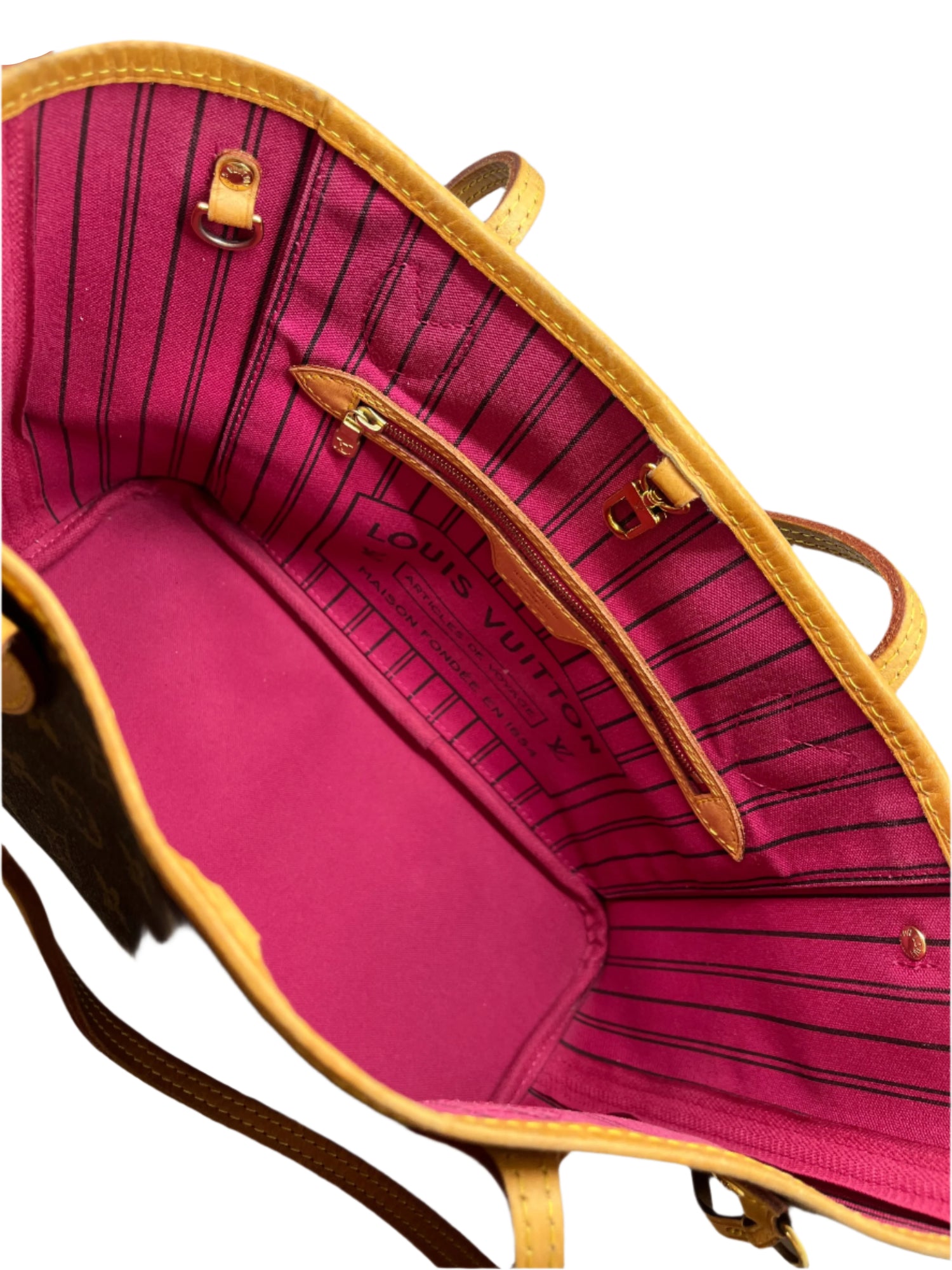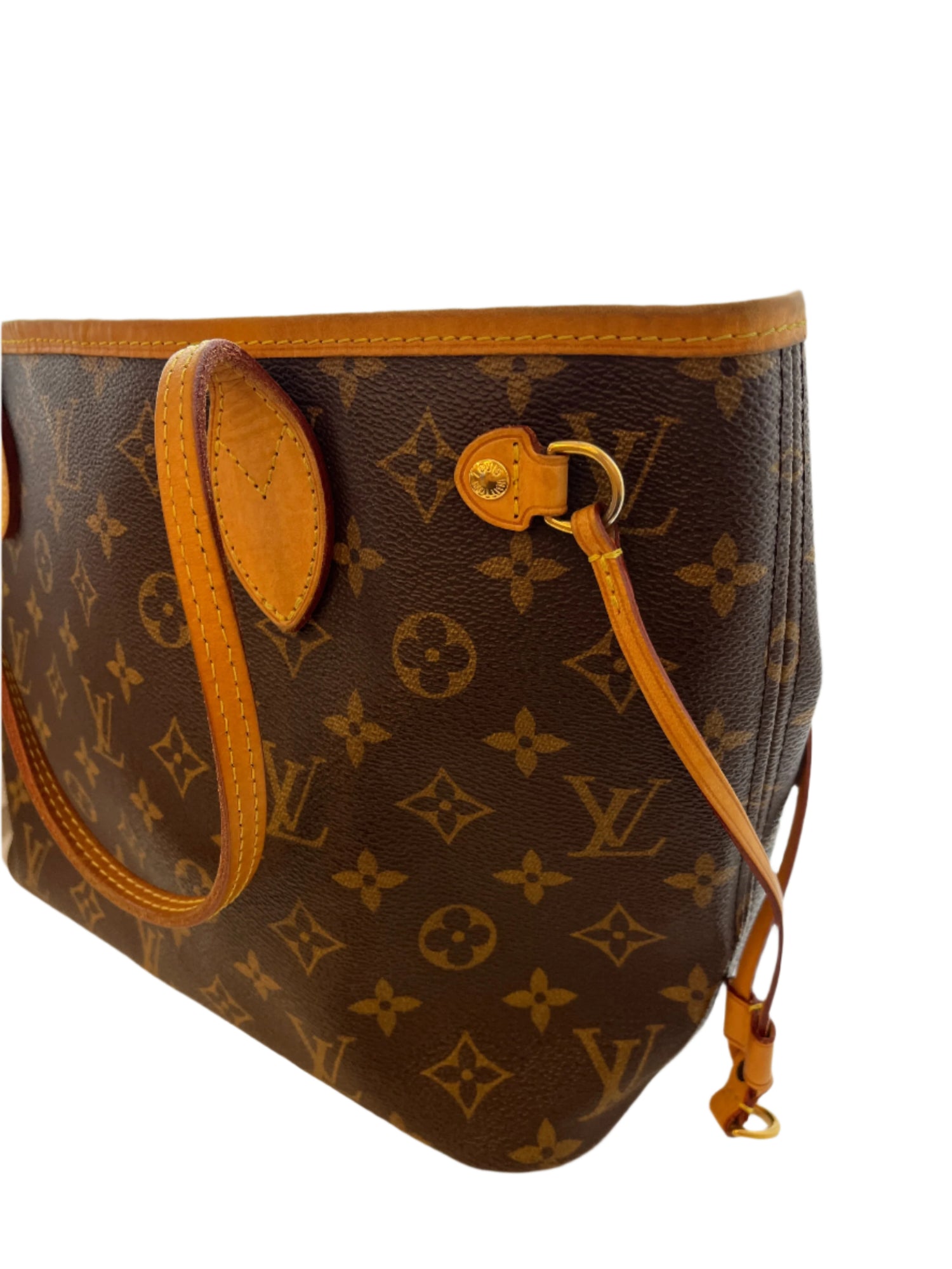 The Neverfull MM tote unites timeless design with heritage details. Made from supple Monogram canvas with natural cowhide trim, it is roomy yet not bulky, with side laces that cinch for a sleek allure or loosen for a casual look. Slim, comfortable handles slip easily over the shoulder or arm. Lined in colorful textile. Comes with a dust bag as well.