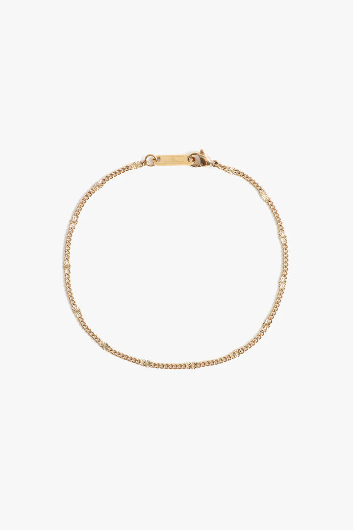 Add a touch of whimsy to your look with the Marrin Costello Paradise Anklet. Featuring a delicate Cuban link chain with celestial engravings, this elegant piece brings subtle shine and charm to any outfit—perfect for everyday wear or special occasions.
