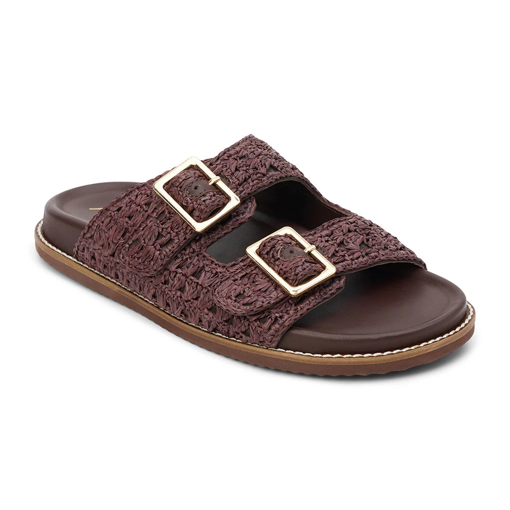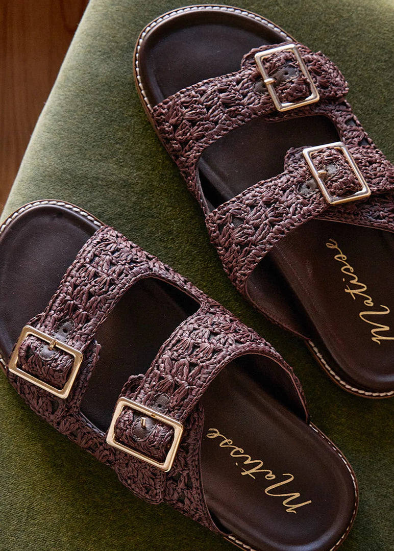 Step into effortless style with the Matisse Posey Slide Sandal. Featuring brown woven raffia, adjustable gold-tone buckles, and a cushioned footbed, these slide sandals blend comfort and casual charm. Finished with a sturdy sole, they’re your go-to for breezy, warm-weather days.