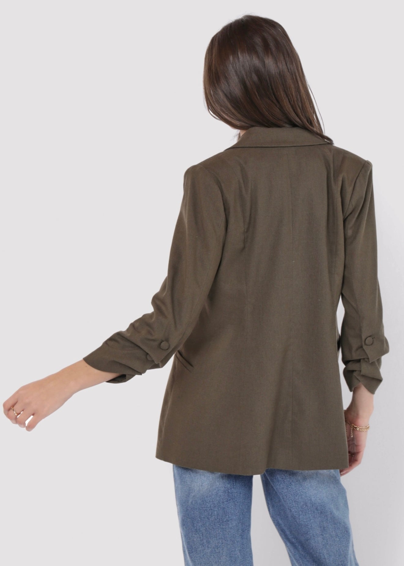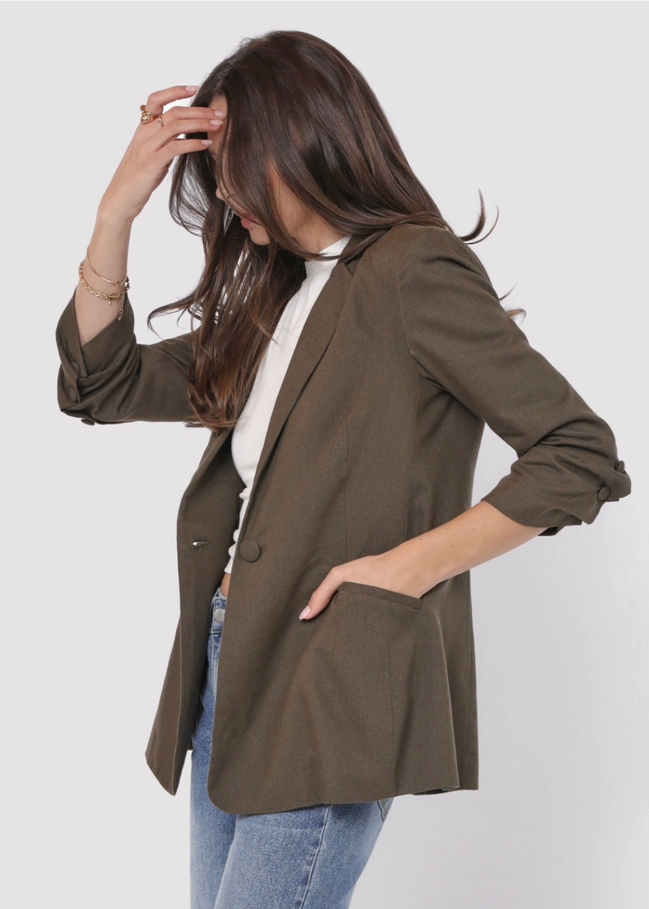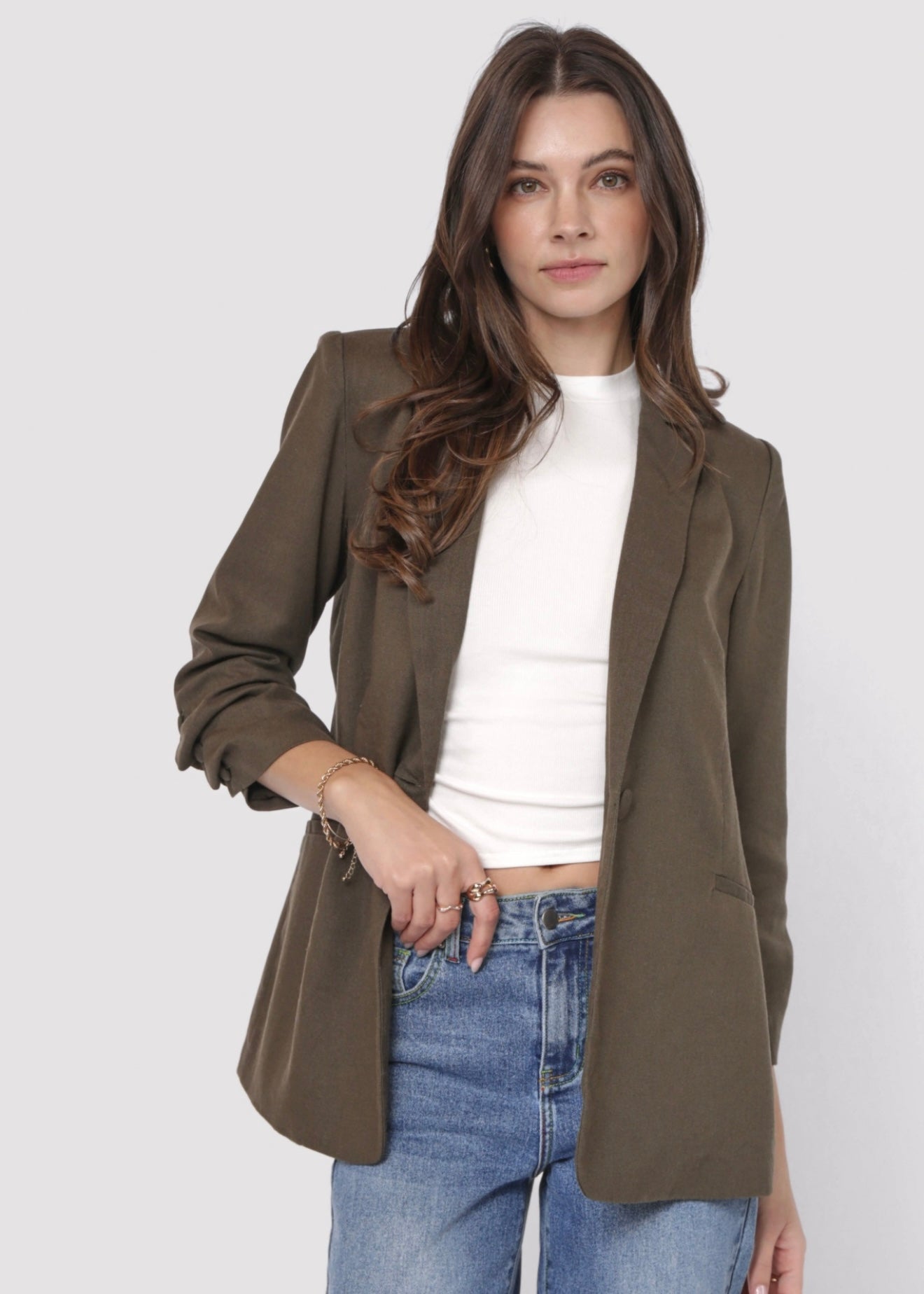 Elevate your layers with the Sadie & Sage Backyard Ruched Linen Blazer. Crafted from a breezy linen blend, this olive-toned blazer features ruched sleeves and an effortless open-front design. Its relaxed, oversized fit delivers the perfect balance of comfort and modern style—ideal for adding a fresh, playful touch to any outfit.